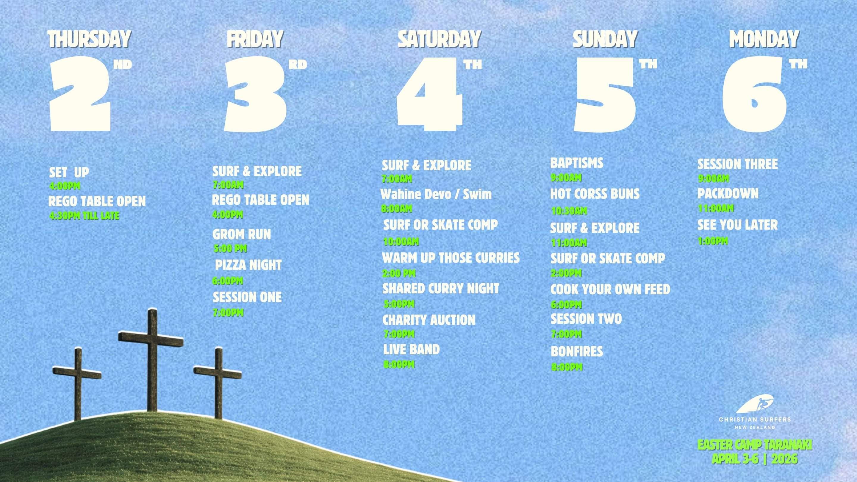 The Christian Surfers Easter Camp is an annual gathering open to all ages. It’s a relaxed, fun-filled weekend with plenty of time for surfing, hanging out with mates, and enjoying everything Taranaki has to offer. Each evening, we’ll come together for worship and hear from incredible speakers who’ll inspire and encourage us in faith and life. And of course, it wouldn’t be Easter Camp without the legendary Christian Surfers Curry Comp, Surf Comp, and Skate Comp! We’d love for you and your whānau to join us for another unforgettable Easter weekend!